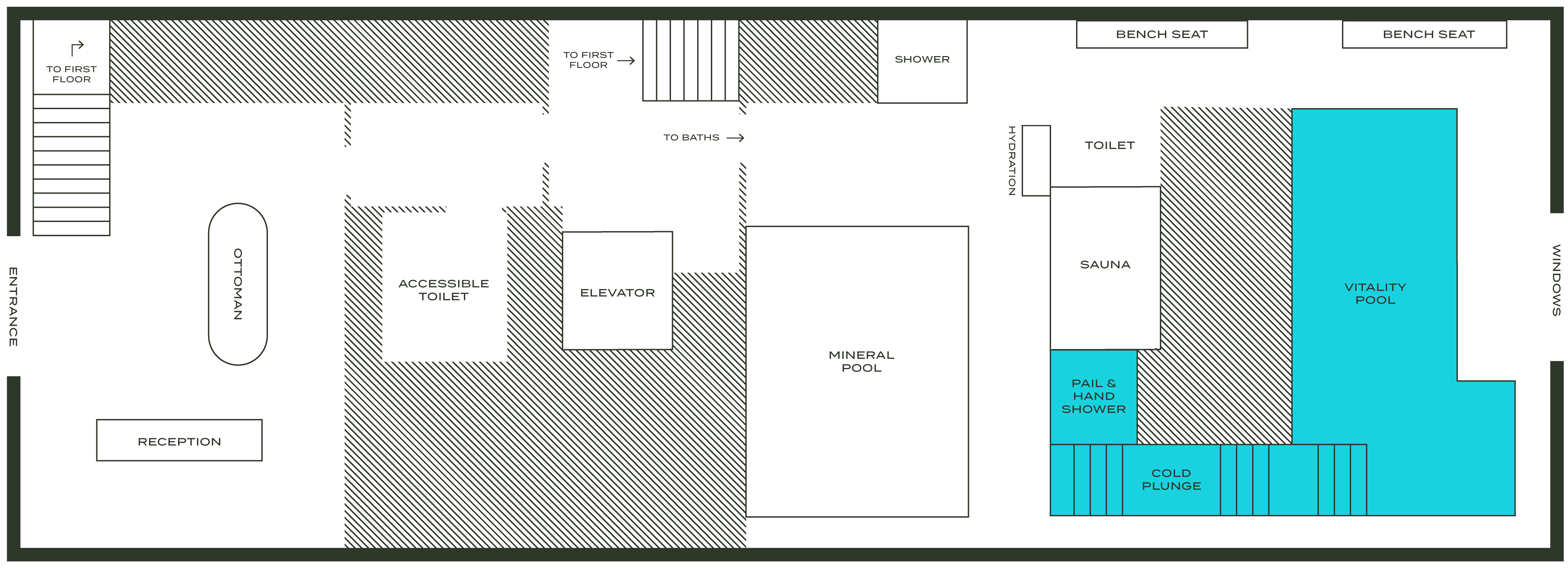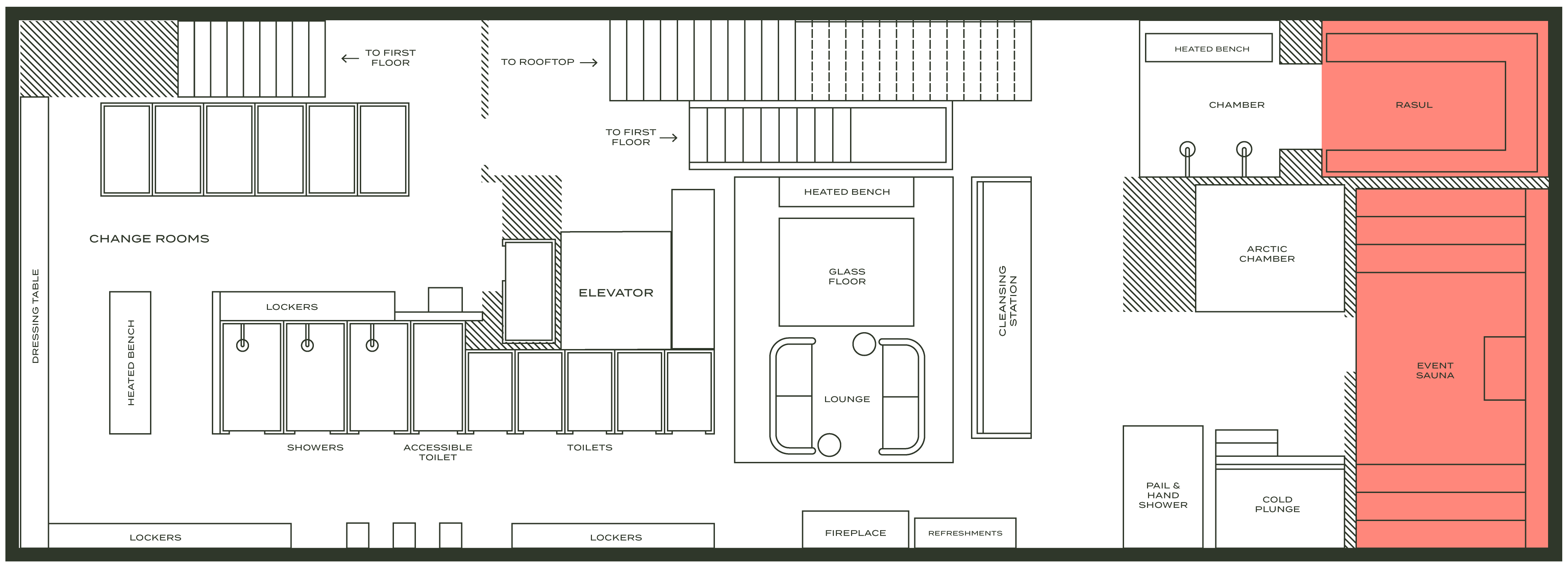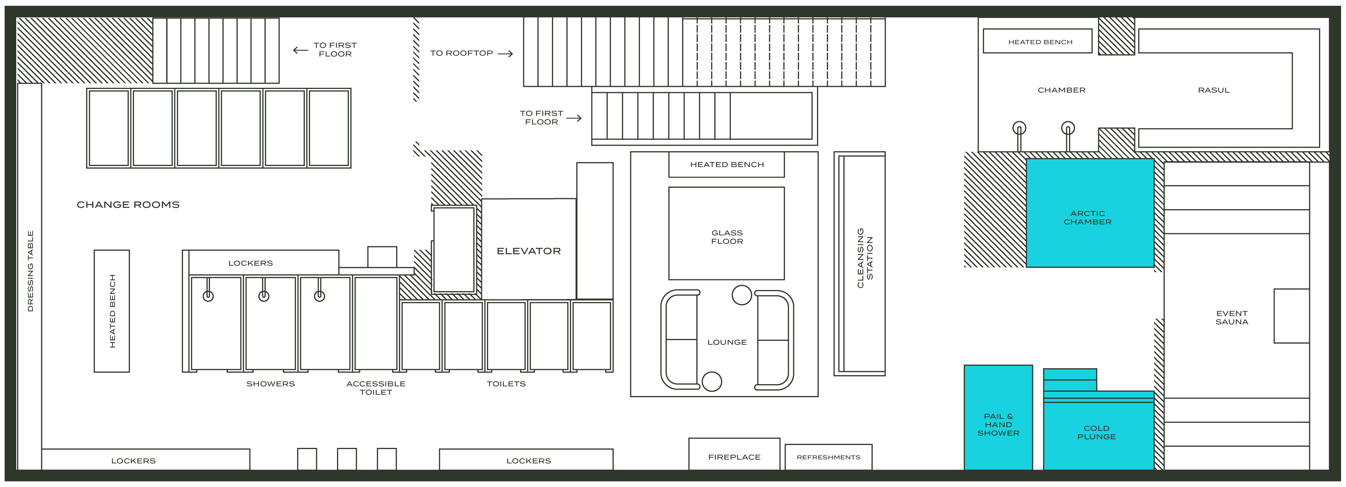 A self-guided bathing ritual designed to be explored at your own pace. Move freely between hot and cold experiences across three levels, following what feels natural for your body. With 95 minutes, there is ample time to settle, restore and discover your own rhythm.