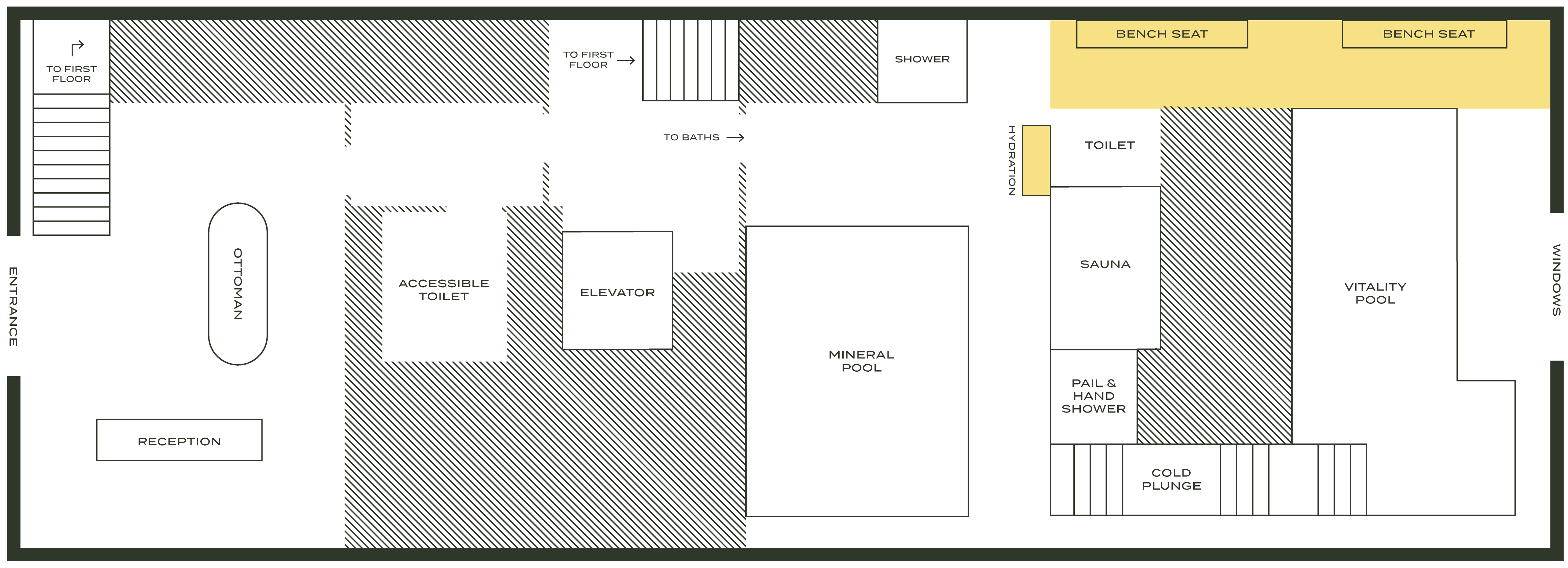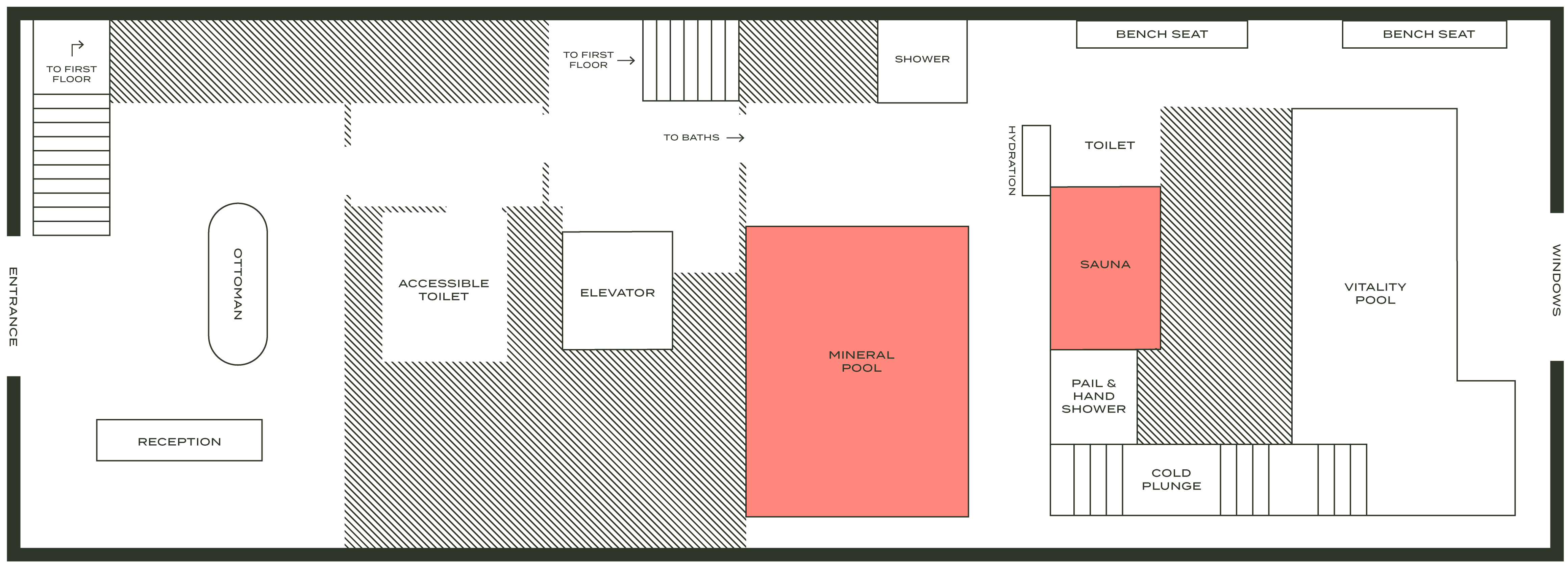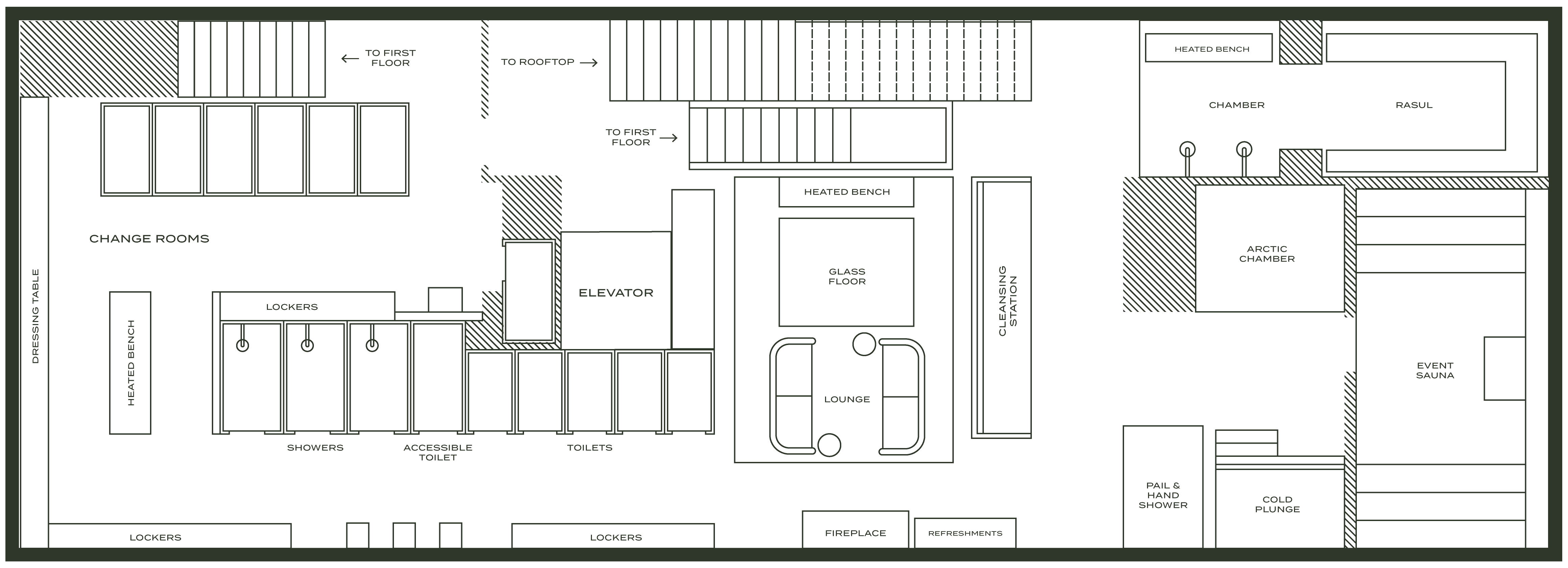 A self-guided bathing ritual designed to be explored at your own pace. Move freely between hot and cold experiences across three levels, following what feels natural for your body. With 95 minutes, there is ample time to settle, restore and discover your own rhythm.